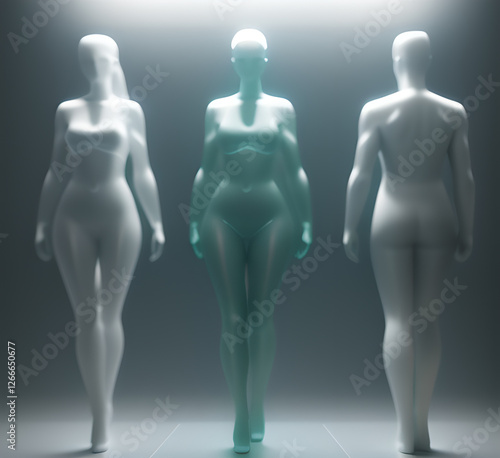 Abstract surrealistic illustration of glass statue several people standing in pose.Concept project.mindfulness and meditation.Futuristic. cyberpunk.innovation different types of poses.generative ai