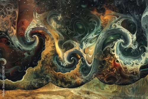 abstract, swirl, swirling, space, galaxy, cosmos, universe, starry, star, night, sky, desert, landscape, sand, dune, gold, green, brown, black, white, light, dark, pattern, texture, artwork, digital, art, illustration, design, background, nature, celestial, cosmic, aethereal, mystical, dreamlike, fantasy