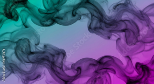Abstract swirling smoke in vibrant teal and purple colors forming a frame against a gradient background