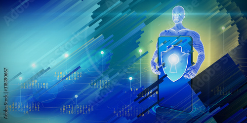 Abstract technology background 3D polygonal man holding a smartphone with a shield. Cyber securityconceot in lines. Concept protect privacy and safety.3D illustration.