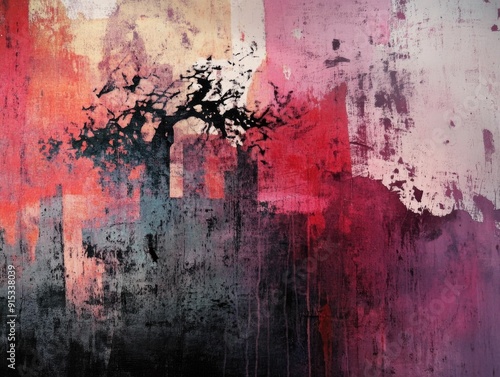 Abstract Tree Silhouette Painting with Red and Pink Splashes on Textured Background