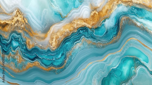 Abstract Turquoise and Gold Fluid Art with Waves and Textures