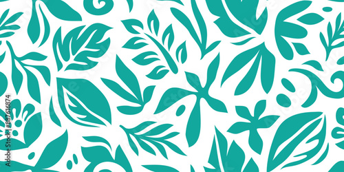 Abstract turquoise and white floral art seamless pattern. Trendy contemporary floral nature shape background illustration. Natural organic plants leaves prints artwork wallpaper. Vintage spring