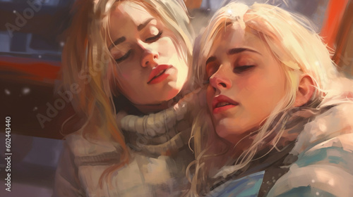 abstract, two young adult women wearing winter clothing, turtleneck sweaters, dramatic despair