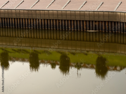 Abstract urban scene with a reflection of a green park, trees, and buildings in the calm water of a city canal. The edge of a modern embankment is visible at the top.