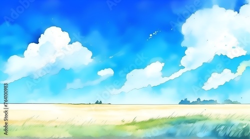 abstract watercolor oil landscape illustration with blue sky and anime style