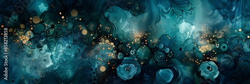 abstract, watercolor, art, gold, speck, teal, blue, black, swirling, shape, contemporary, painting, background, texture, ink, design, pattern, fluid, organic, modern, style, colourful, vibrant, bright, dark, light, contrast, movement, energy, water, galaxy, universe, cosmic, nature, fantasy, dream