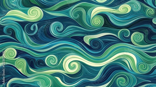 Abstract waves with gradient blues and greens, creating a cool and refreshing pattern reminiscent of flowing water.