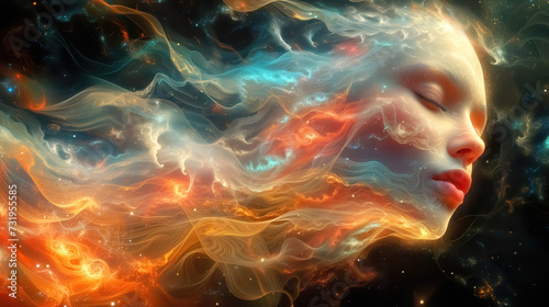 Abstract wavy background with woman face and multicolored waves patterns, 3D artistic wallpaper.