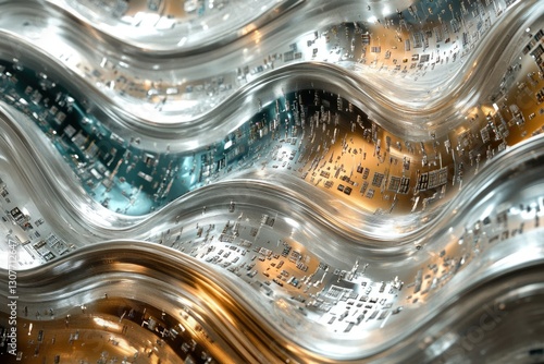 Abstract wavy metallic surface with embedded circuit patterns, futuristic tech concept.