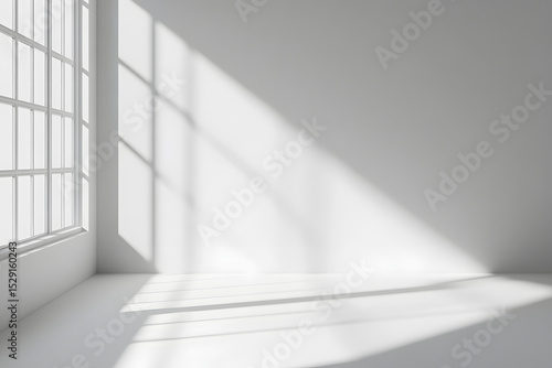 Abstract white studio background for product presentation. Empty room with shadows of window. Display product with blurred backdrop.