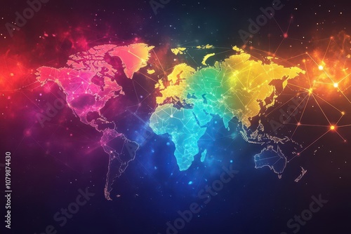 Abstract world map with interconnected economic zones, bright arrows representing trade paths, vibrant colors, high detail
