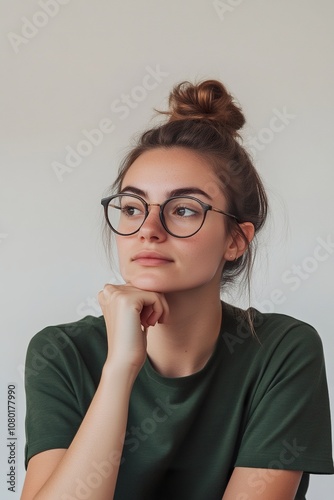 abstracted girl, thinking about her things, with her hair tied back and green t-shirt.