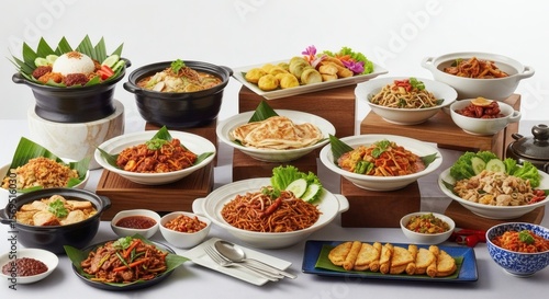 Abundant Asian Cuisine Buffet Display with Diverse Traditional Dishes, Perfect for Festive Gatherings and Culinary Celebrations