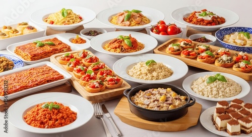 Abundant Italian Culinary Spread Showcasing a Diverse Assortment of Classic Pasta Dishes, Savory Appetizers, Creamy Risotto, and Delectable Desserts for a Grand Feast Concept