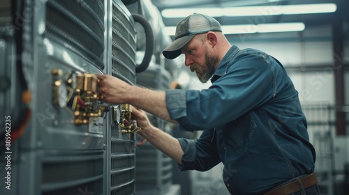 AC technician performing routine maintenance on a large factory air conditioning system, realistic photography