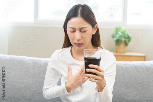 Acid reflux disease, suffer asian young woman, girl hand holding a glass of cola, have symptom gastroesophageal, heartburn pain on chest when drinking sparkling, soft water. Healthcare medical concept