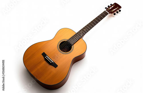 Acoustic guitar isolated white background. Natural wood finish, classic design. Instrument for musicians, music lovers, guitar enthusiasts. Perfect for music lessons, performances, studio recordings.