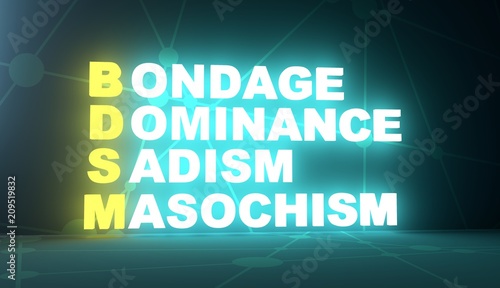 Acronym BDSM - Bondage, Dominance, Sadism amd Masochism. Technology conceptual image. 3D rendering. Neon bulb illumination