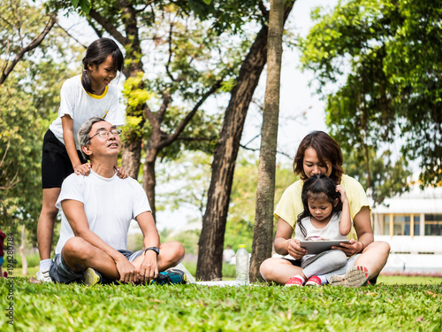 activity, adult, age, asian, children, childhood, children, concept, daughter, exercise, family, father, female, generation, generation, girl, grandchild, granddaughter, grandfather, grandparent, group, happy, holiday, leisure, lifestyle, male, man, massage, mother, mother, multi, old, outdoors, eltern, parenting, park, people, relaxing, senior, sitting, smiling, tablet, technology, together, vacation, woman