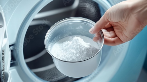 Adding laundry detergent to a modern washing machine during a household chore in a bright laundry room