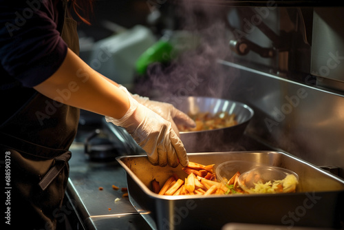 Adept hands managing food in a food truck environment with a blurred surrounding.