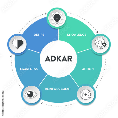 ADKAR framework diagram chart infographic with icon vector for banner presentation template has awareness, desire, knowledge, action and reinforcement. Change management model. Business and marketing.