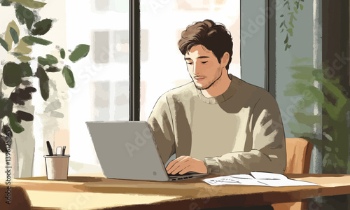 man, sitting, table, laptop, hot drink, cup, computer, technology, cyberspace, person, student, business, modern, working, businessman, adult, lifestyle, young, communication, freelance, male, job, indoor, man, desk, office, home, casual attire, smiling, happy, online, professional, notebook, education, photogenic, using, typing, entrepreneur, horizontal, caucasian, smart, occupation, portrait, photo, workplace, studying, guy, learning, designer