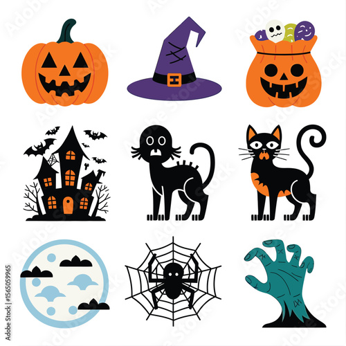 halloween, pumpkin, vector, set, bat, ghost, icon, illustration, holiday, cartoon, sorcerer, cat, spider, autumn, hat, horror, skittish, symbol, skull, black, design, monster, october, silhouette, night