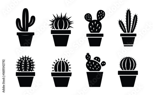 desert, white, succulent, clean, collection, illustration, minimalist, object, silhouette, shape, spiny, home, icon, graphic, symbol, aloe, background, vector, agave, different, pot, prickly
