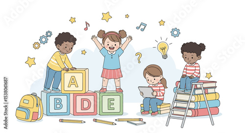 Adobe illustrator artwork vector illustration of diverse, happy children engaging in various learning activities with books, blocks, and technology, symbolizing education and creativity