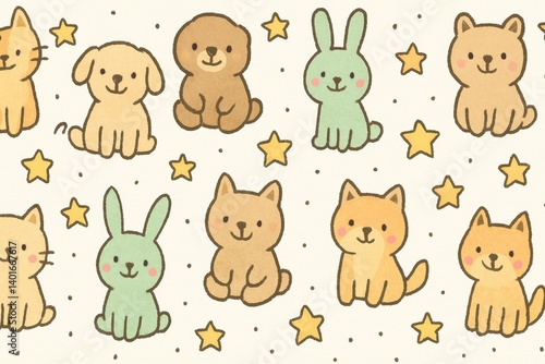 animal, cute, linear, dog, cat, bear, rabbit, star, playful, simple, character, design, art, pattern, decorative, graphic, cartoon, gentle, fun, adorable, children, childlike, happy, minimal, whimsical, collection, vignetting, pastel, soft, charming, outline, friendly, sweet, lovely, tender, joyful, imaginary, fantasy, delightful, delight, enchanting, cheerful, illustration, creative