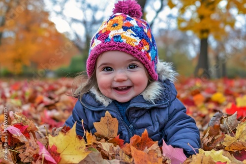 Adorable baby beaming with joy amidst colorful autumn leaves.