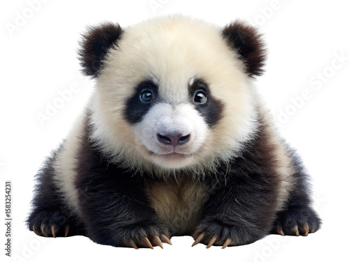 Adorable baby giant panda cub with striking blue eyes sitting and looking directly at the camera isolated on transparent background