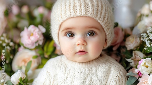 baby, girl, rose, flower, infant, adorable, cute, hat, knitted, portrait, children, toddler, sweet, pretty, lovely, beautiful, innocence, childhood, happiness, joy, bloom, blossom, flower petals, spring, summer, newborn, little, small, young, expression, face, eye, skin, healthy, pure, delicate, soft, tender, peaceful, serene, calm, photo, image