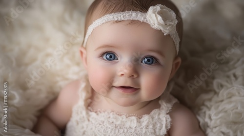 Adorable baby girl with blue eyes smiling on soft textured background perfect for family announcements or greeting card designs
