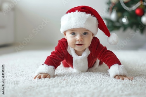 Adorable Baby in Festive Santa Costume Plays on White Carpet at Home Generative AI