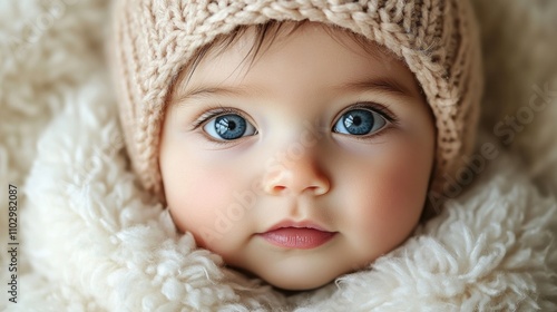adorable baby with blue eyes wearing a knitted hat and snuggled in cozy fur against a soft white background