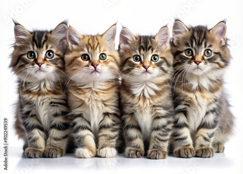 Adorable ball of fluff kittens aligned in a row, showcasing their unique fur patterns, playful personalities, and irresistible whiskers, against a clean white background.