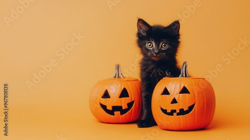 Adorable black kitten with Halloween pumpkins, orange background.