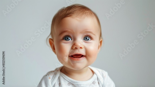 Adorable blue-eyed baby with cheerful expression in white outfit