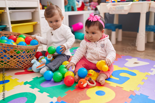 Adorable boy and girl playing with balls sitting on floor at kindergarten