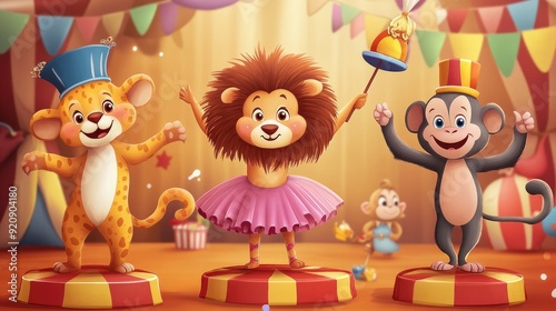 Adorable cartoon circus animals in costumes, such as a lion in a tutu and a monkey with a magician's hat, performing tricks