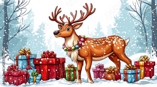 Adorable cartoon reindeer surrounded by decorated Christmas presents in a snowy forest, embracing the holiday spirit