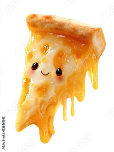 Adorable cartoon slice of cheesy pizza with a happy face, melting cheese, and playful expression
