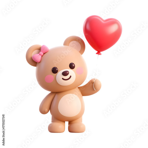 Adorable Cartoon Teddy Bear Holding a Red Heart Balloon on Transparent Background