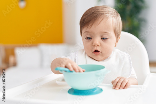 adorable, caucasian, baby, infant, newborn, girl, person, female, little, toddler, lifestyle, expression, sitting, relax, relaxing, resting, rest, comfortable, comfort, sunlight, relaxed, relaxation, food, high, chair, table, feeding, eat, eating, nourishment, bib, spoon, dish, plate, home, house, apartment, indoor, indoor, interior, bedchamber, room, background