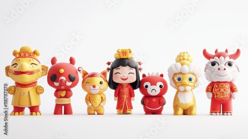 figurine, character, chinese, new, year, red, gold, yellow, cute, adorable, traditional, costume, festive, celebration, holiday, auspicious, lucky, prosperity, wealth, happiness, joy, family, togetherness, harmony, culture, heritage, symbol, icon, design, art, three-dimensional, render, model, illustration, graphic, image, white, background, collection, set, display, row, animal, lion, ox, girl, cat