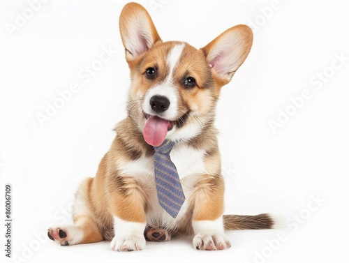 Adorable Corgi Puppy with Upright Ears and Necktie on Seamless White Studio Background