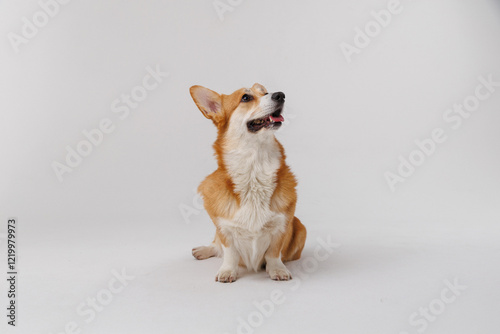 Adorable Corgi sitting on white background looking up with playful curiosity